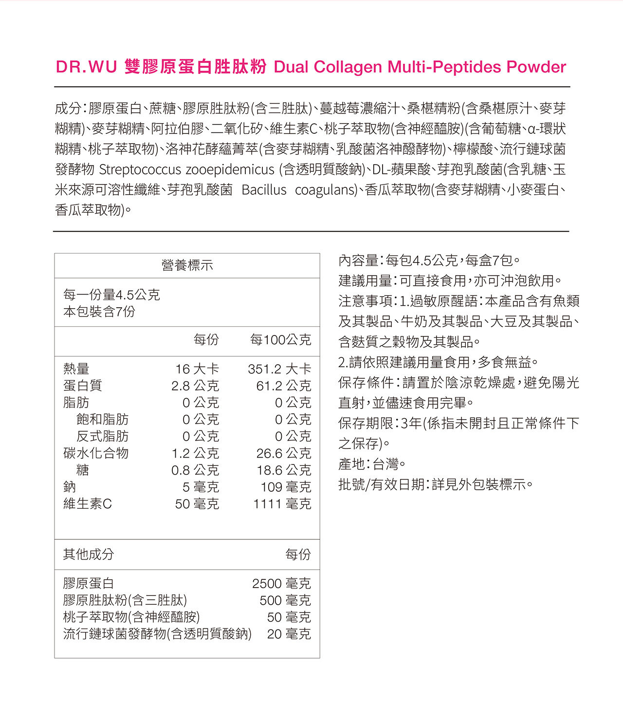 Dr Wu Dual Collagen Multi-Peptides Powder Plus Probiotic 4.5g/pack x 28 packs 雙膠原蛋白胜肽粉4.5G/包 x 28包 每日美肌關鍵 從體內打好保養底子